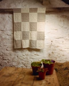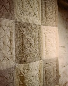 The blanket uses a total of 12 x 100g skeins of Langsoond Shetland DK yarn, 6 in Keksie (undyed white) and 6 in Stane (undyed grey). If you stick to the recommended gauge of the pattern, each square measures 28cm (11in) x 28cm(11in) and the completed blanket measures 168cm (66.25in) long; 112cm (44in) wide.